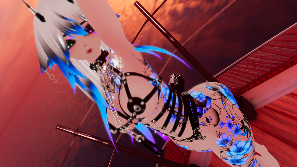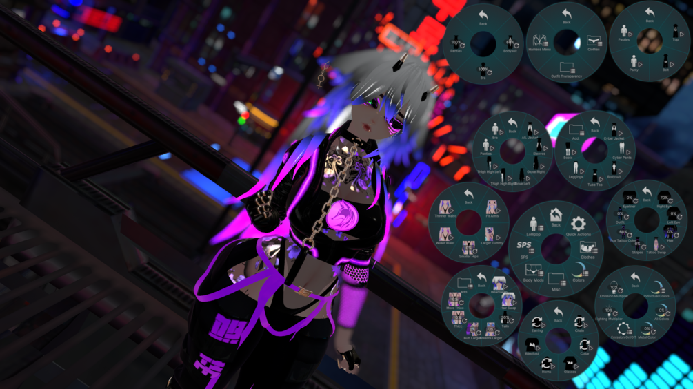 Clothing Toggles: Underwear, Left Thigh High, Right Thigh High, Left Glove, Right Glove, Sleeves, Jacket, Cyber Jacket, Cyber Pants, Bodysuit, Tube Top, Leggings, Boots, Blindfold, Earring, Chain, Collar, Glasses, Harness: Top, Belt, Underwear, Underwear and Bodysuit Transparency Slider